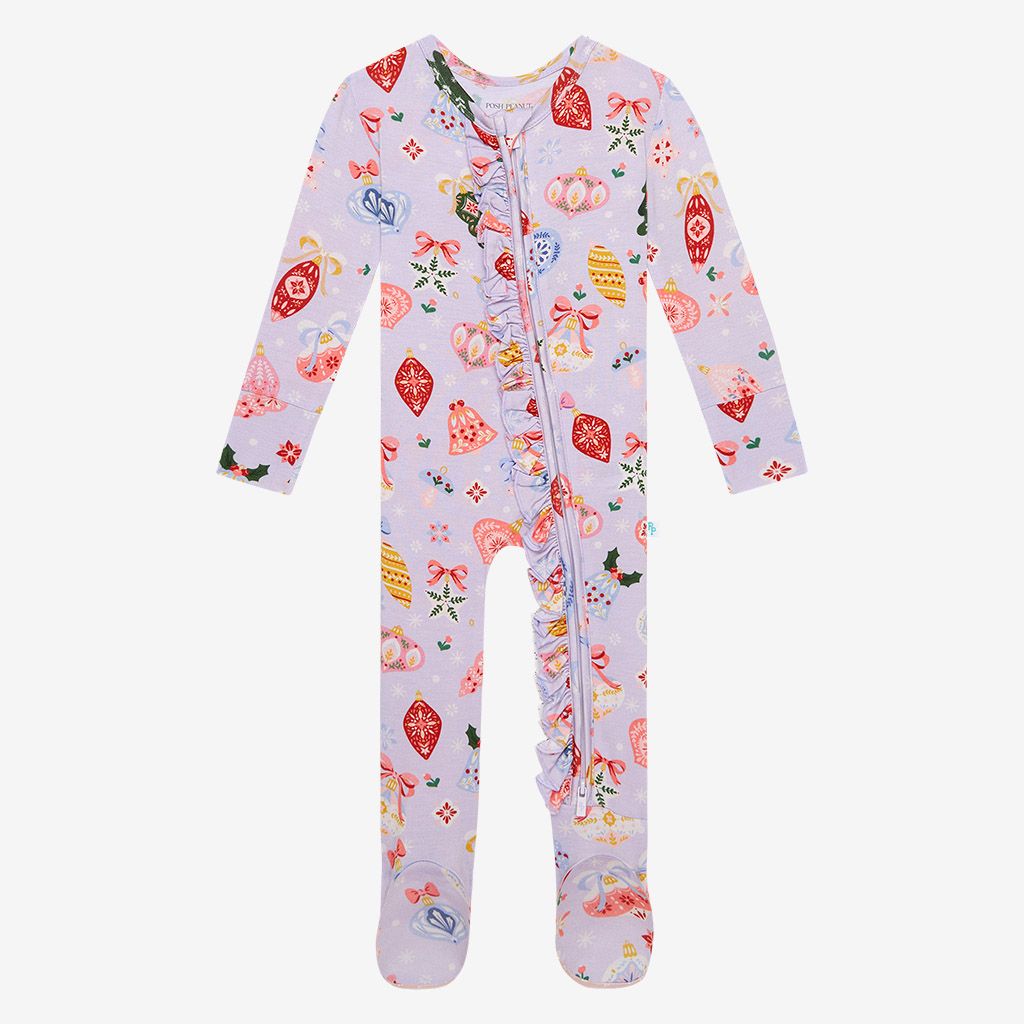 Reimagine your essentials in our coveted girls ruffled footie reversible zippered one-piece in Päpook® viscose from bamboo. Ultra-soft viscose makes our footies the perfect addition to everyday wear. Ruffle detail on bodice and layers of ruffle on the back for a cute added detail—Posh Peanut® signature non-slip grips on the footie for walkers. The reversible 2-way zipper makes diaper changes quick and easy without undressing your baby down. Elastic backing on footies for a snug fit, built-in fold-over mittens in sizes NB and 0-3M. Jammies so cute you can wear them out!