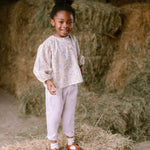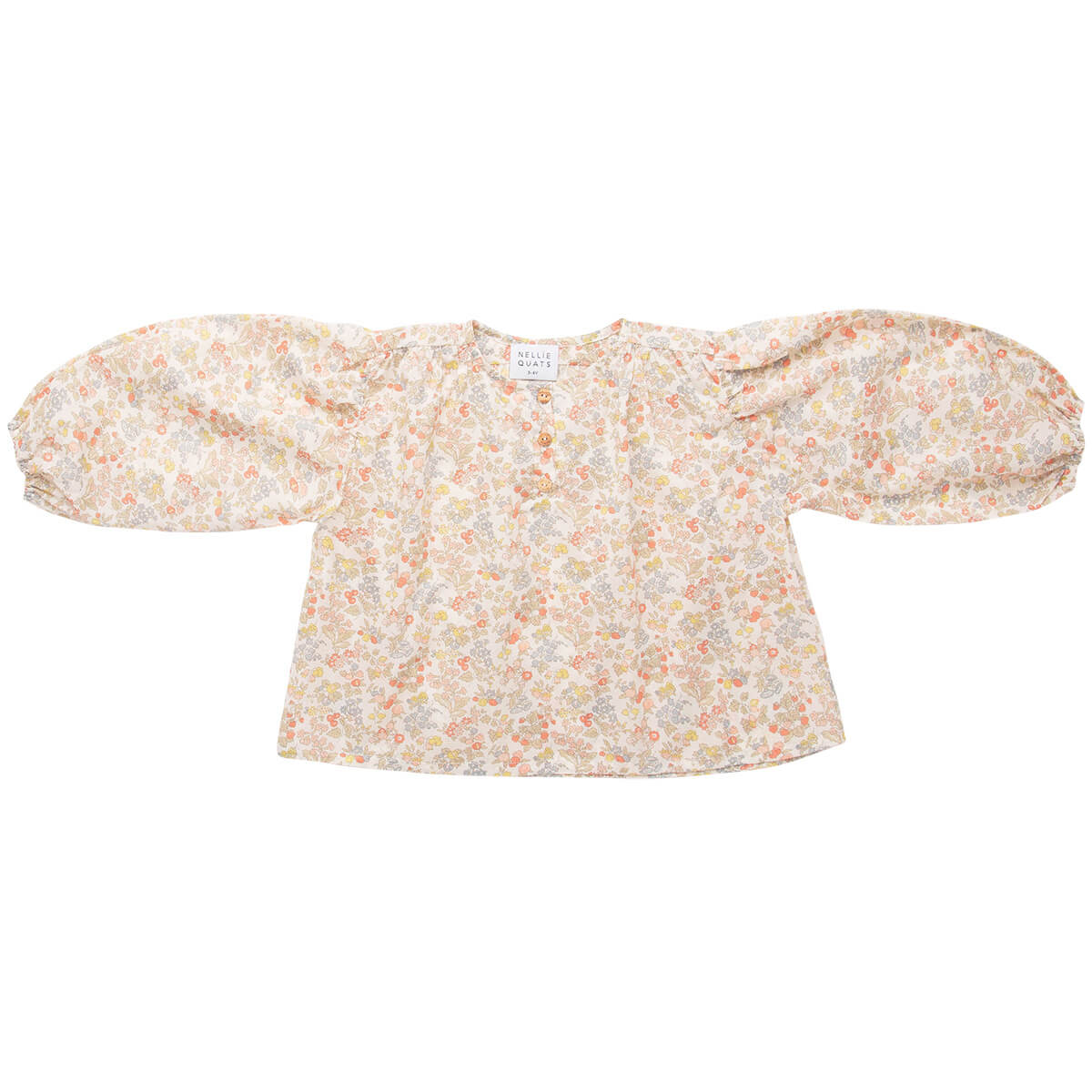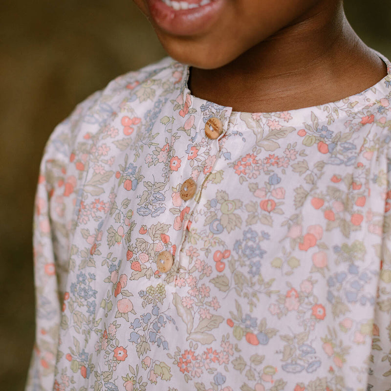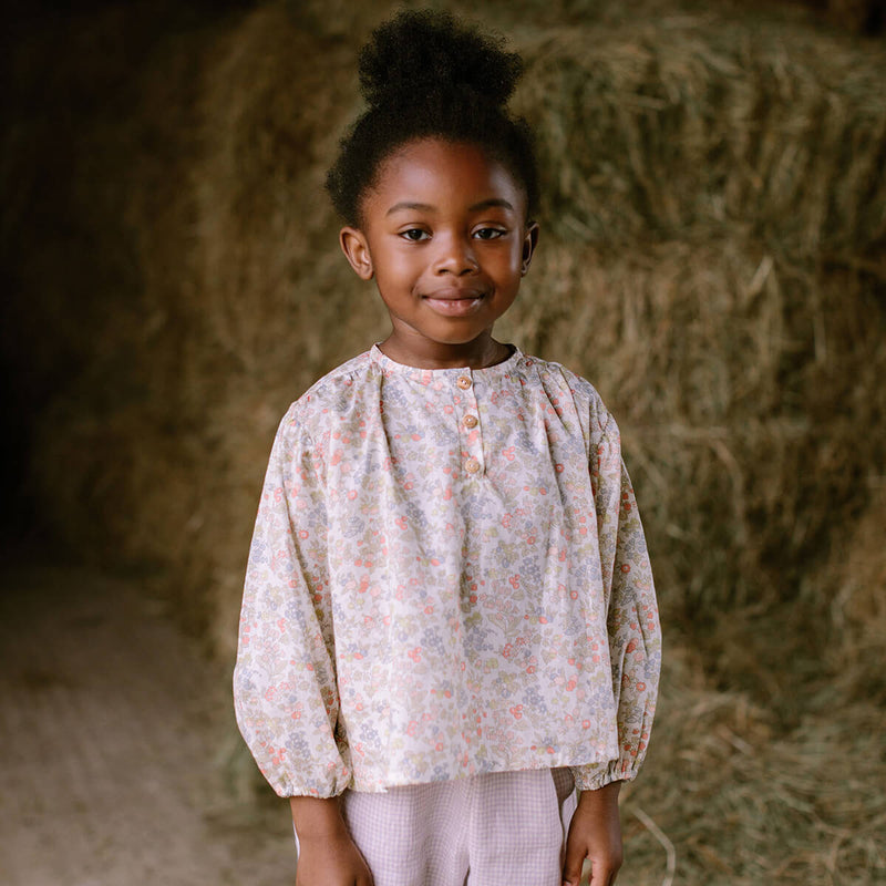 Mother May I blouse by Nellie Quats. Loose fit, peasant blouse, with full length sleeves, elasticated cuffs and mother of pearl buttons on a front working placket. Back and front are gathered for an oversized style and comfortable fit. Made from beautiful Nancy Ann Liberty print tana lawn organic cotton, an exclusive print to Nellie Quats.