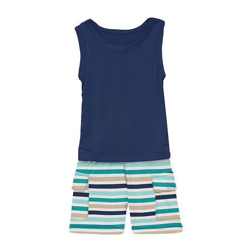 Kickee Pants Tank & Cargo Short Outfit Set - Sand and Sea Stripe