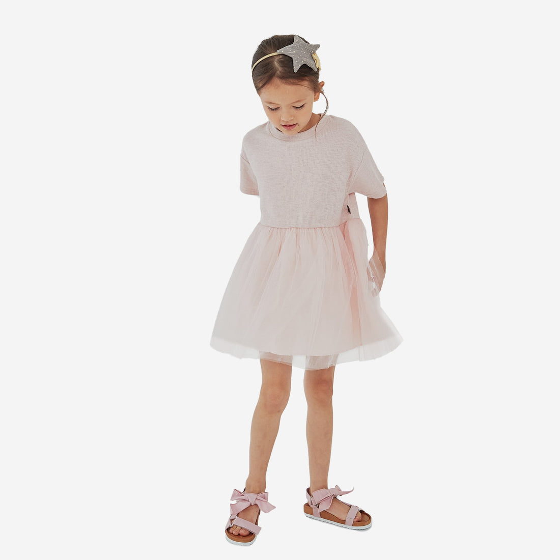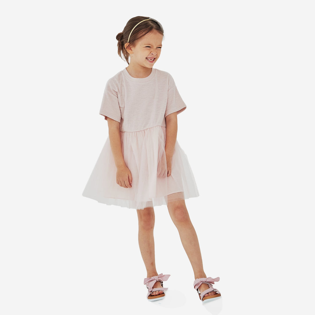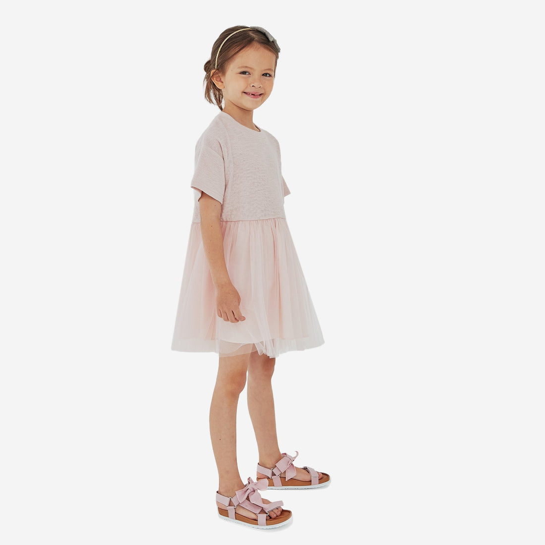 This girls' short-sleeve dress is designed with a soft top that combines with the tulle overlay on lined bottom for a beautiful look that she'll love.