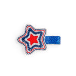 This clip features a star-shaped appliqué with silver glitter, and a red and blue star outline design. The alligator clip is ribbon-covered to help grip the hair.