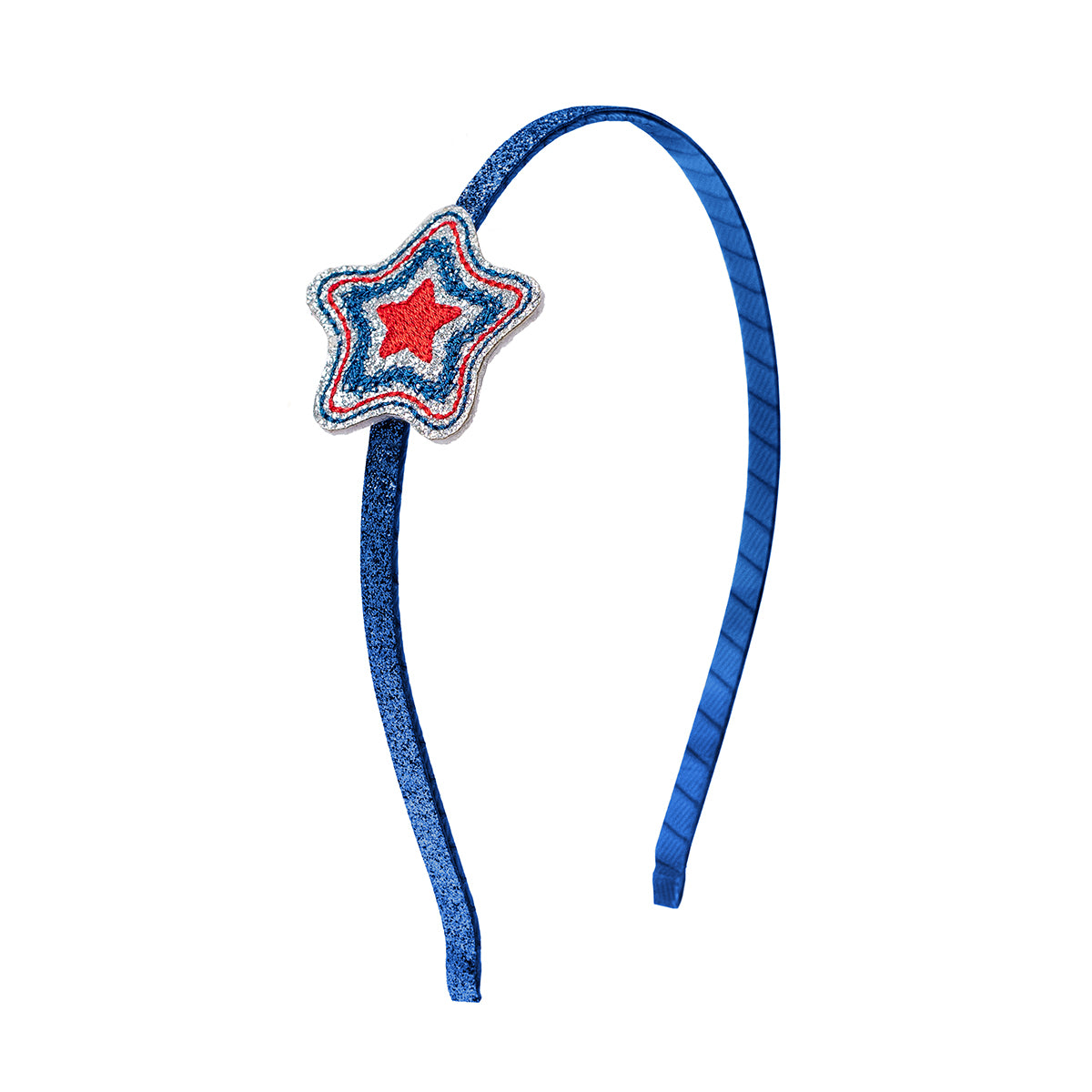 The Sparkle Star Kids Headband features a star-shaped appliqué with silver glitter, and a red and blue star outline design. The inside of the headband is lined with satin ribbon for comfort and the outside of the band is decorated with blue glitter (don't worry - the glitter doesn't shed!).