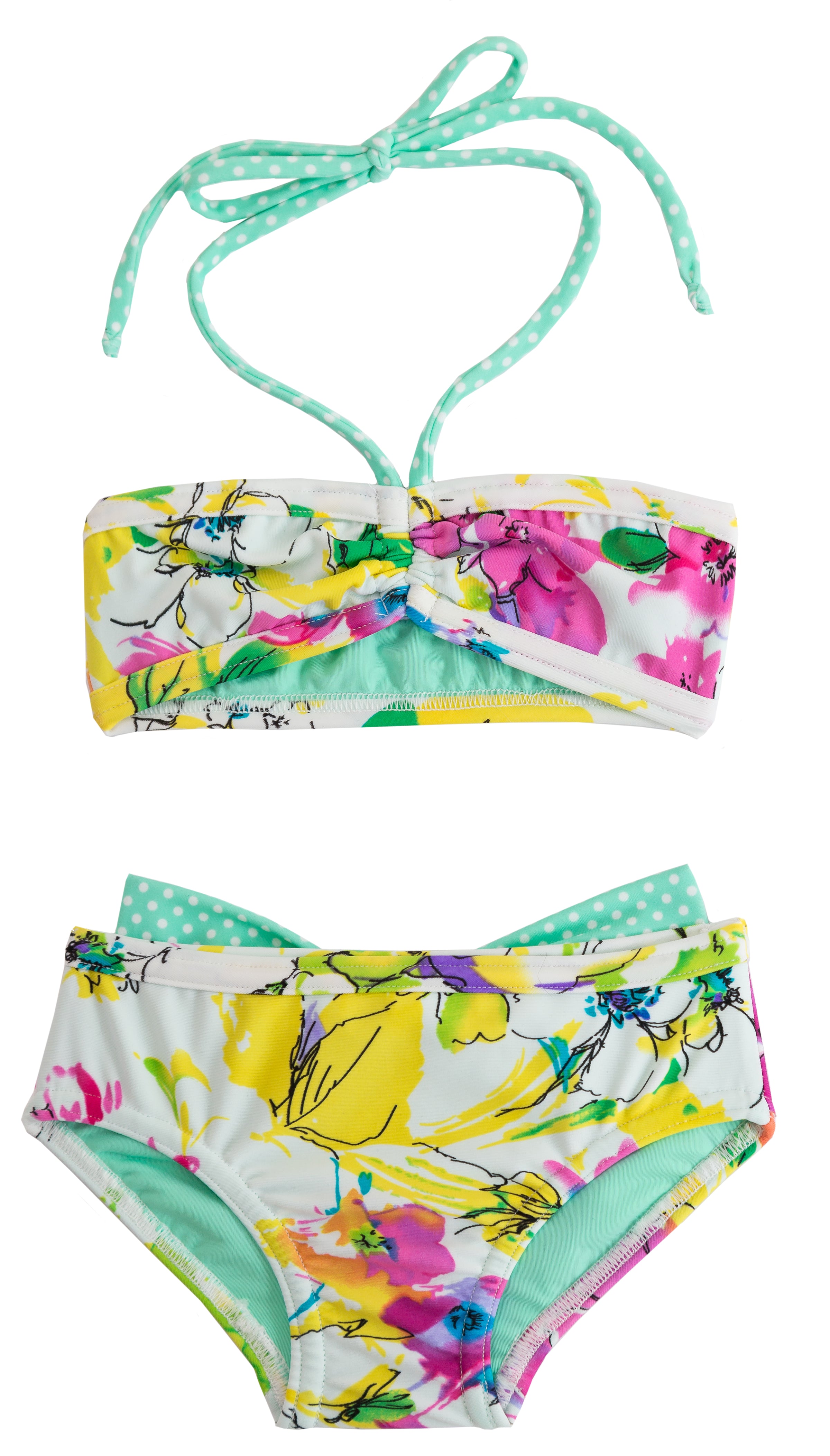 Another adorable combination of prints in a super sweet style! The drawstring front creates a perfectly ruched top. And what babykini is complete without a big bow on the bottom!