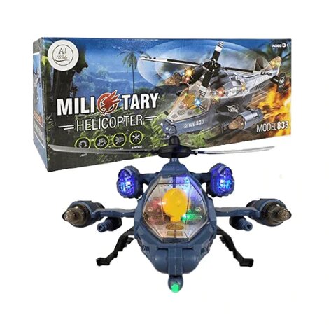 Just slide the switch to see this battery operated vehicle race across the room and change direction with every obstacle! Helicopter makes engine noises and plays music.