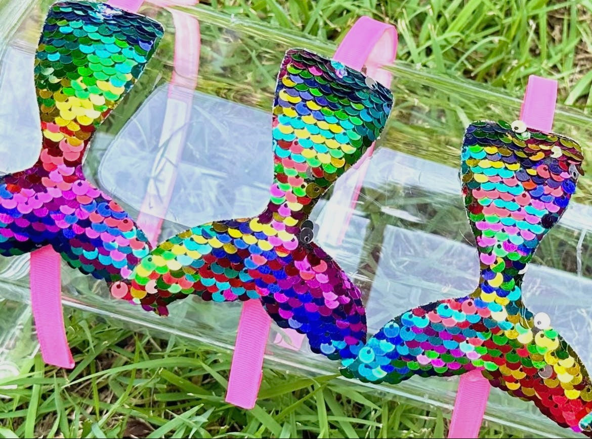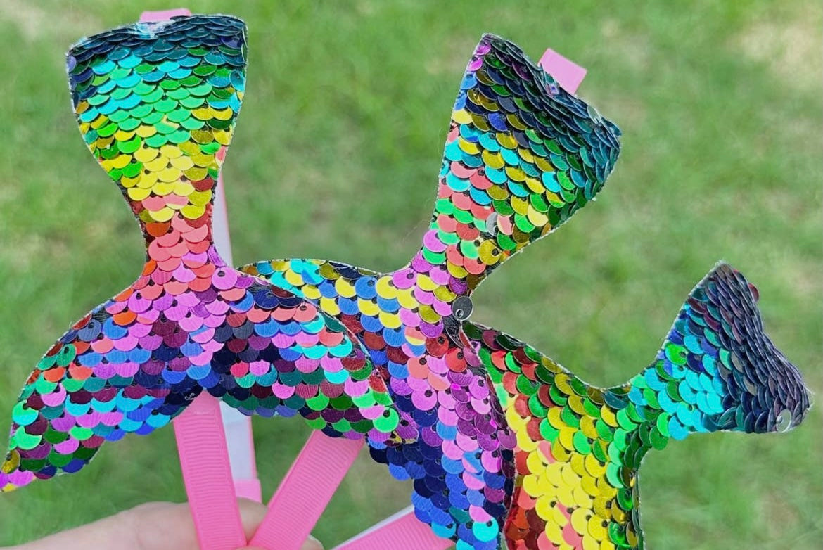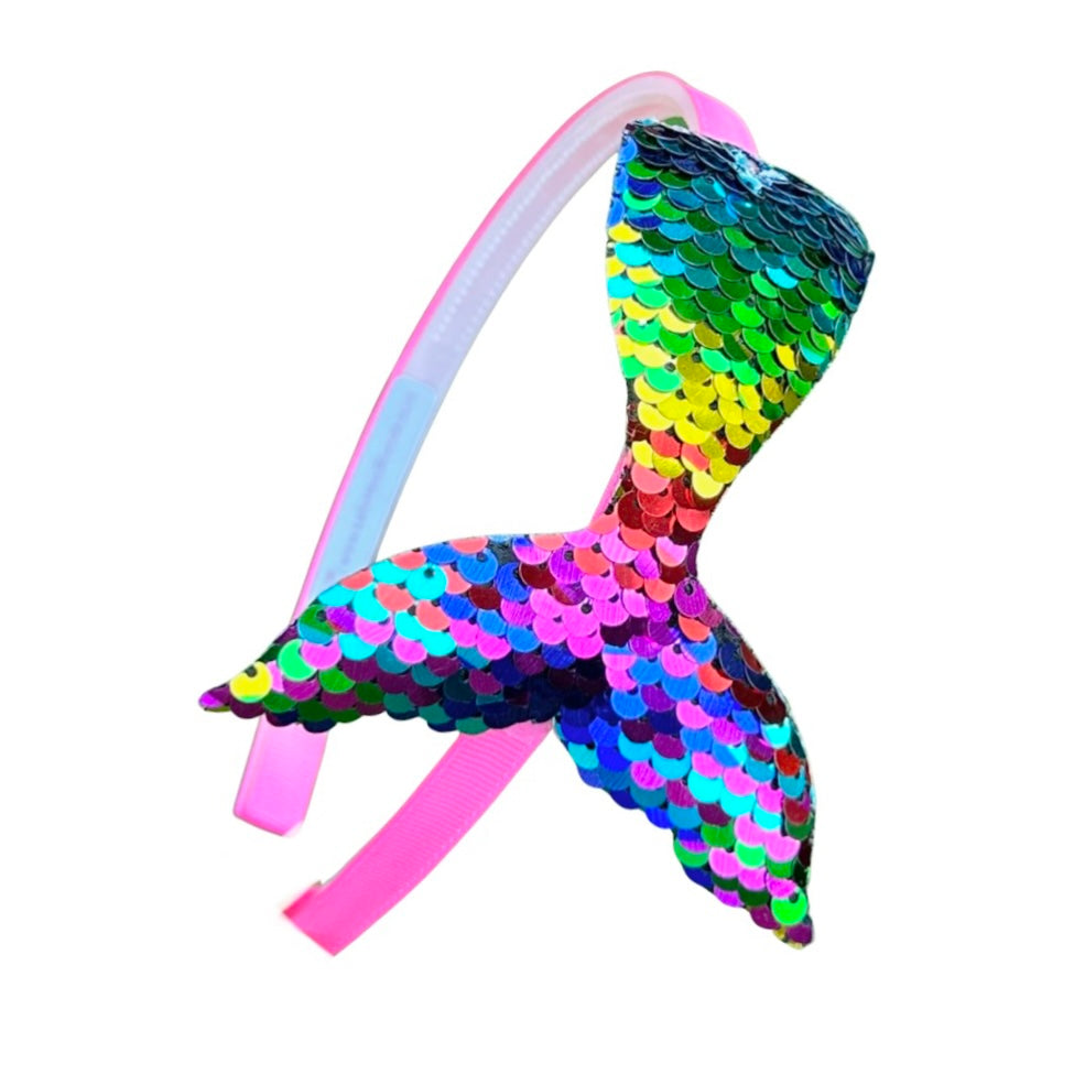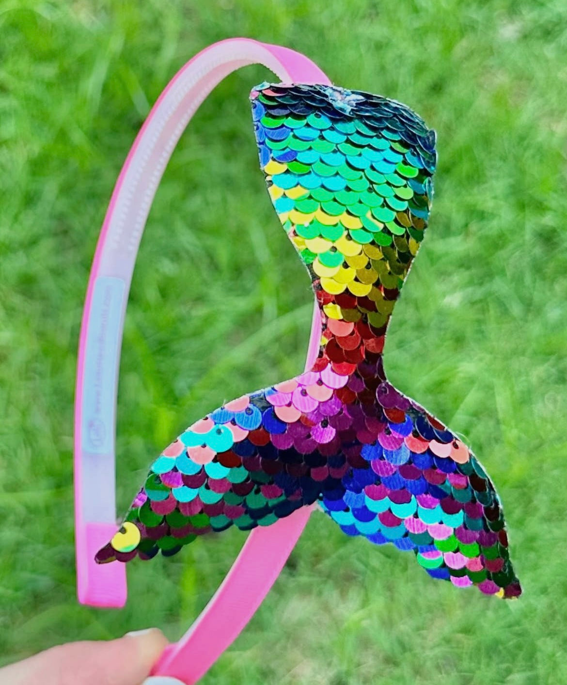 Fun 4" soft, puffy multicolored, flip sequin mermaid tail on a candy pink grosgrain headband. Multicolored sequins flip to all silver. Each lolo product is created for non-pinch comfort. With any glitter product, we always ensure a quality non-shedding product. we hope that you enjoy your lolo products just as much as we enjoy creating them for you!