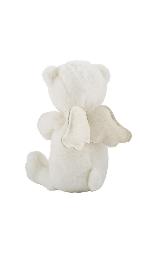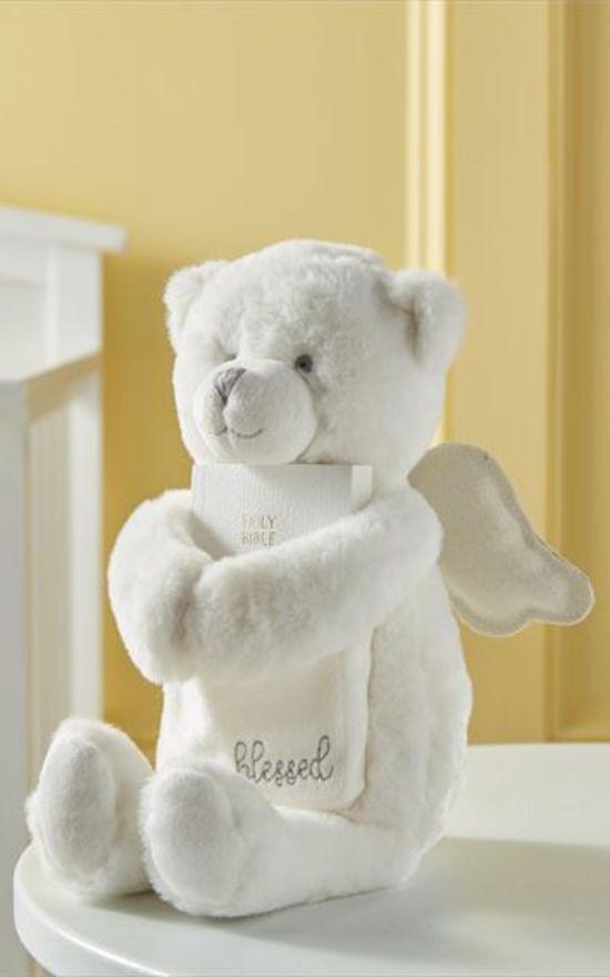 2-piece set. Faux fur bear plush features stuffed shimmer wings, magnet hands, and elastic chest pocket to hold included small New Testament Bible.