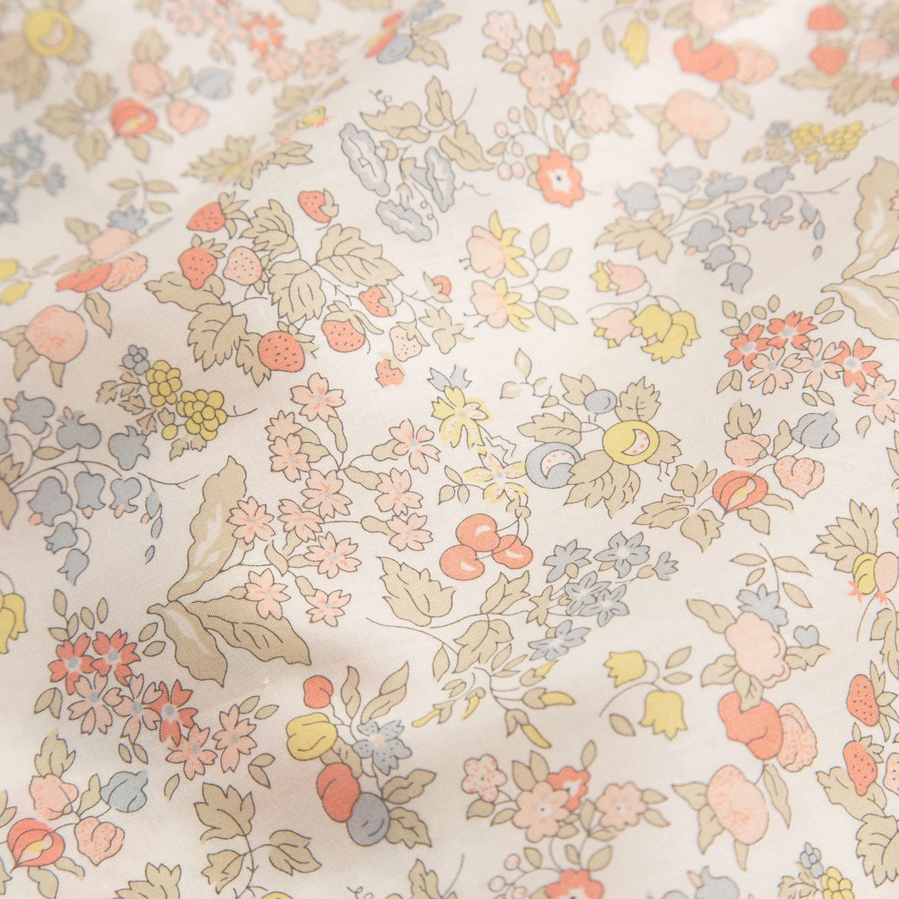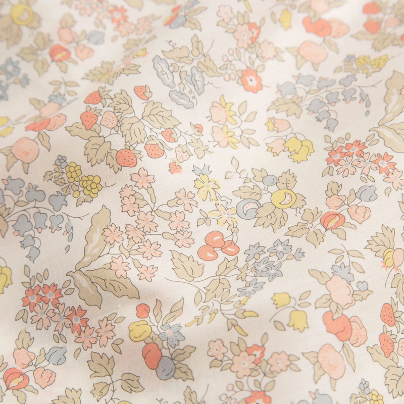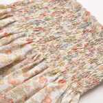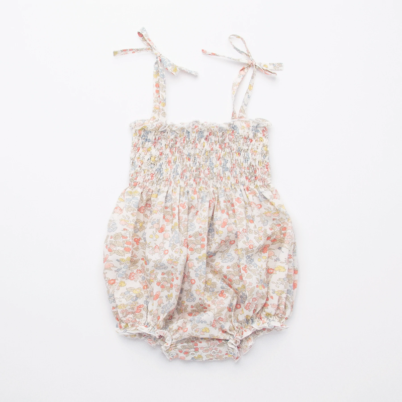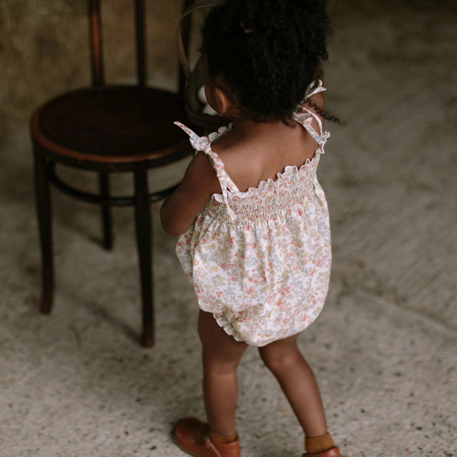 Shirred bodice romper with ruffle along the top edge and tie up adjustable straps. Attached body is gathered for a stylish, full, comfortable fit. Leg holes are elasticated with shirring and romper has poppers for ease of opening. Designed to sit at the top of the thigh, perfect layered over tights in cooler weather and without in the summer. Made from beautiful Nancy Ann Liberty print tana lawn organic cotton, an exclusive print to NQ.