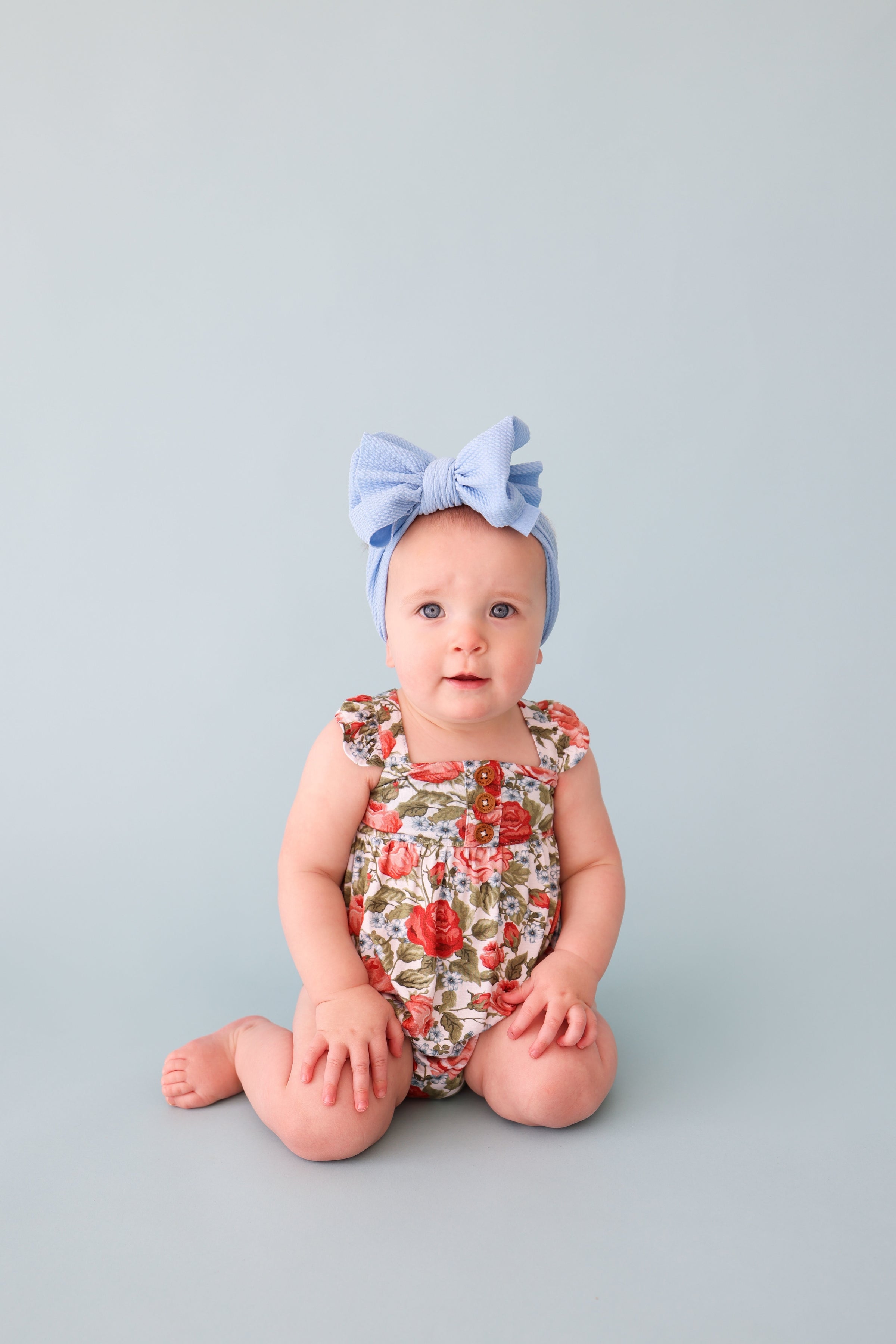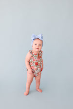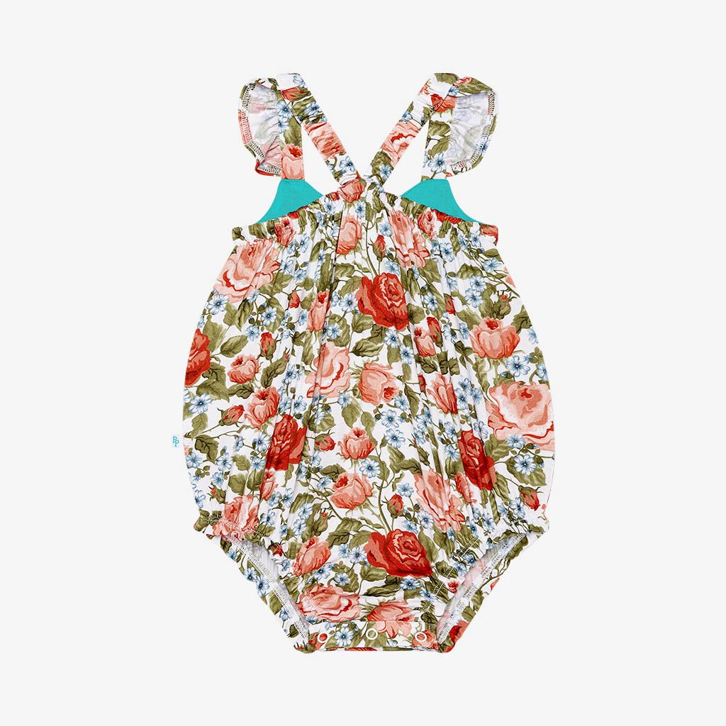 Ruffle cap sleeve bubble rompers are the perfect outfit for any occasion. Päpook® viscose from bamboo, breathable, lightweight, and oh so cute! Ruffle details on straps with signature teal lining. Stretchy elastic in back to adjust as your peanut grows, comfortable, and makes for the perfect warm-weather outfit.