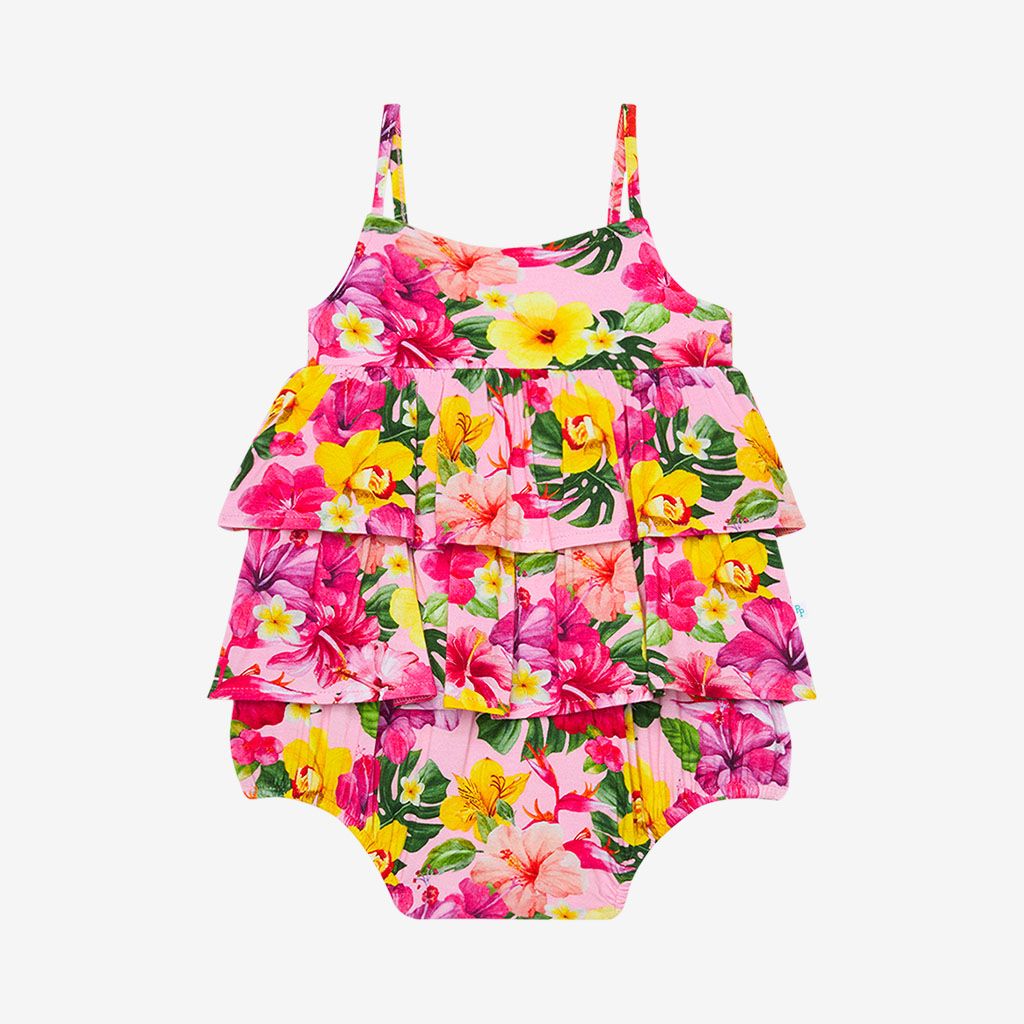 Spaghetti strap bubble rompers are the perfect lightweight summer outfit! Päpook® viscose from bamboo is buttery soft, breathable, and oh so cute! Dainty bow sleeve detail, ruffled bodice, and snap closure for an easy diaper change.