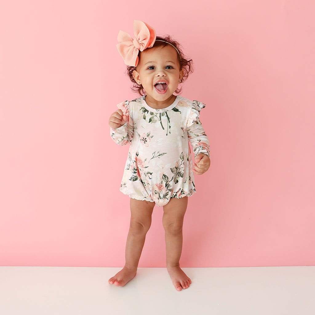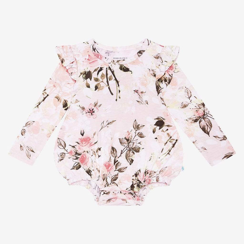 Posh Peanut® long-sleeve bubble rompers are perfect for cooler months in signature, ultra-soft Päpook® bamboo. Ruffle details, scoop neckline, and snap closure on the shoulder for fast and easy changing.