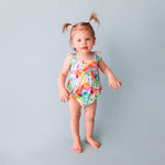 Ruffle cap sleeve bubble rompers are the perfect outfit for any occasion. Päpook® viscose from bamboo, breathable, lightweight, and oh so cute! Ruffle details on straps with signature teal lining. Stretchy elastic in back to adjust as your peanut grows, comfortable, and makes for the perfect warm-weather outfit.