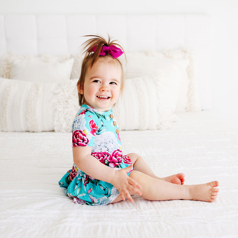 Short sleeve bodysuit with henley neckline and twirl skirt detail. Pair it with your fave shorties, pants, and more. Long sleeve bodysuit is great for fall and winter. 3-snap closure for easy diaper changes.