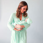 Our signature women's mama robes are a must-have for postpartum and so comfortable to wear during the stages of your growing belly! Wrap yourself in buttery soft viscose from bamboo and stay sleepless in style! Women's robes feature a 3/4 inch sleeve length and have a uniquely placed tie for your growing belly with security holes for no peek-a-boos—a signature design for the modern mom.