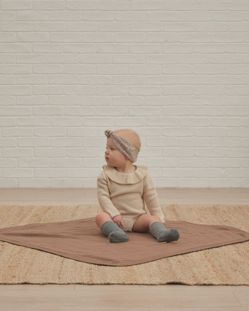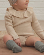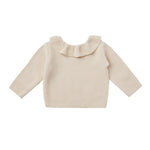 Pullover sweater with a ruffled collar and button back neck closure. Pairs perfectly with our knit bloomers.