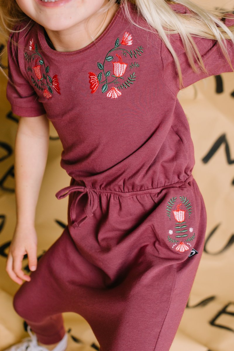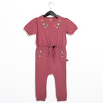 Rags Puff Sleeve Gather Waist Romper - Flower Embroidery Roan Rouge
