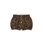 Woven shorts featuring three buttons on the front. Elastic waistband and leg openings create a bubble silhouette easy for changing. Fully lined for the highest quality. Featuring our 'winter bloom' allover pattern in vintage black. Machine wash cold. Tumble Dry low. Minor shrinkage may occur if tumble dried. Made of 100% viscose