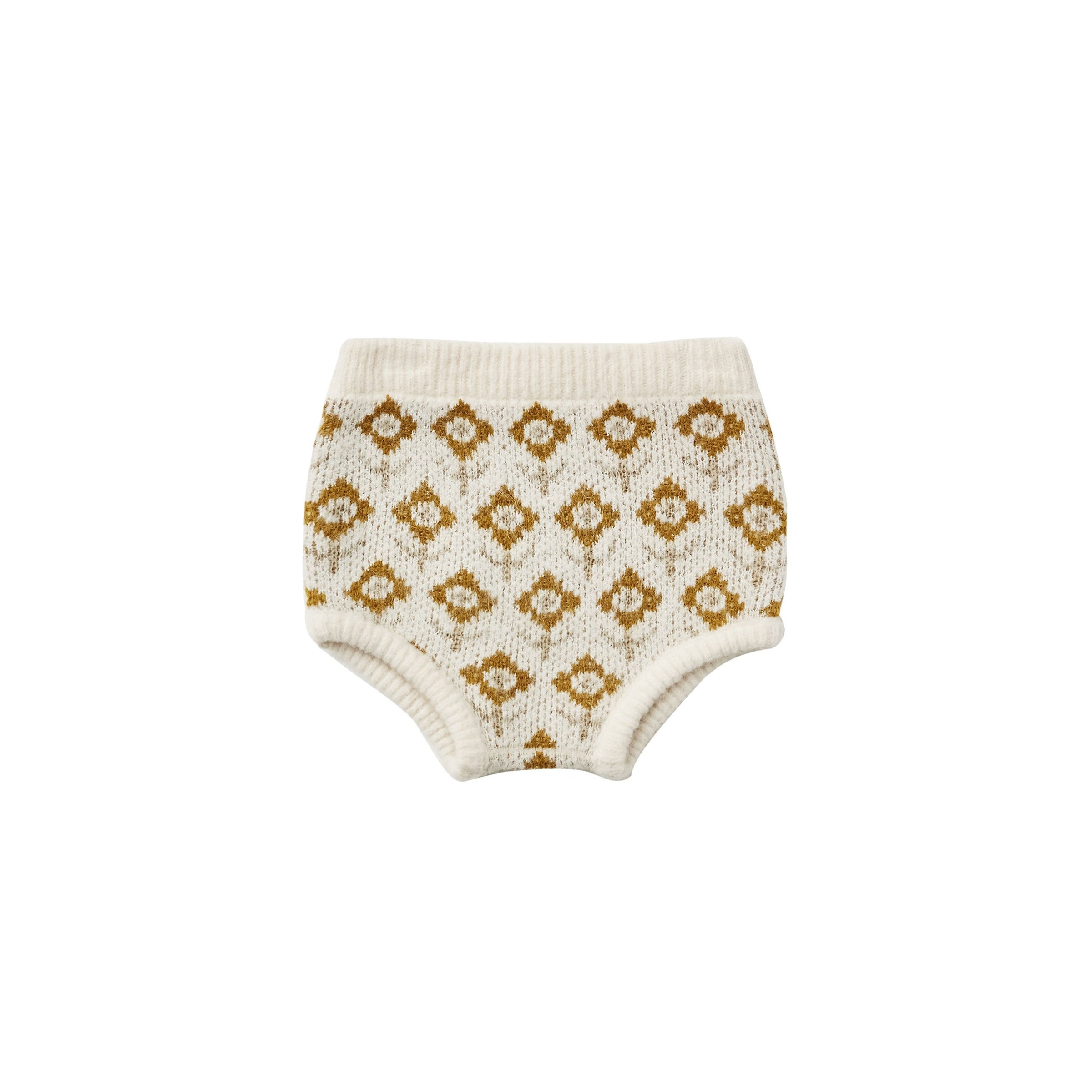 This knit bloomer is made of the softest jacquard knit with an all over pattern. Finished with a ribbed waistband and leg openings.