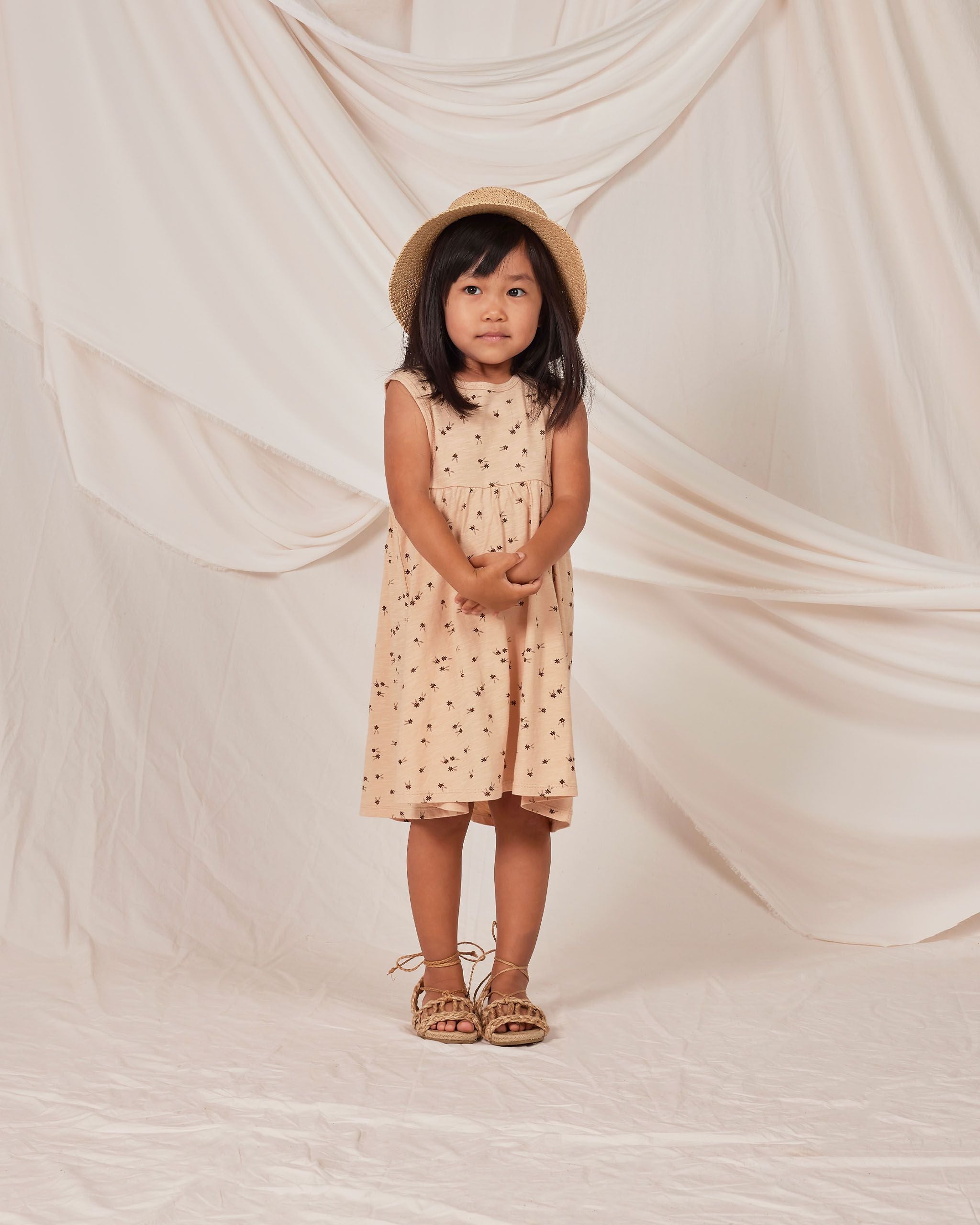Sleeveless babydoll dress made from the softest cotton jersey, featuring a gathered skirt + snap placket at neck for easy changing.