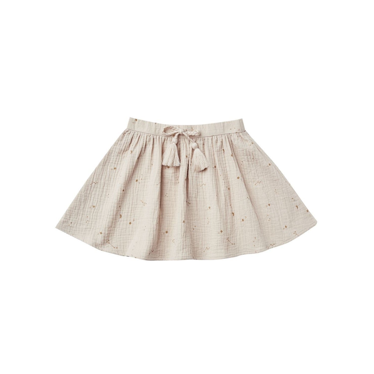 A full gathered swing skirt crafted from a cotton crepe material. Completed with an elastic waistband with rope and tassel at center front.