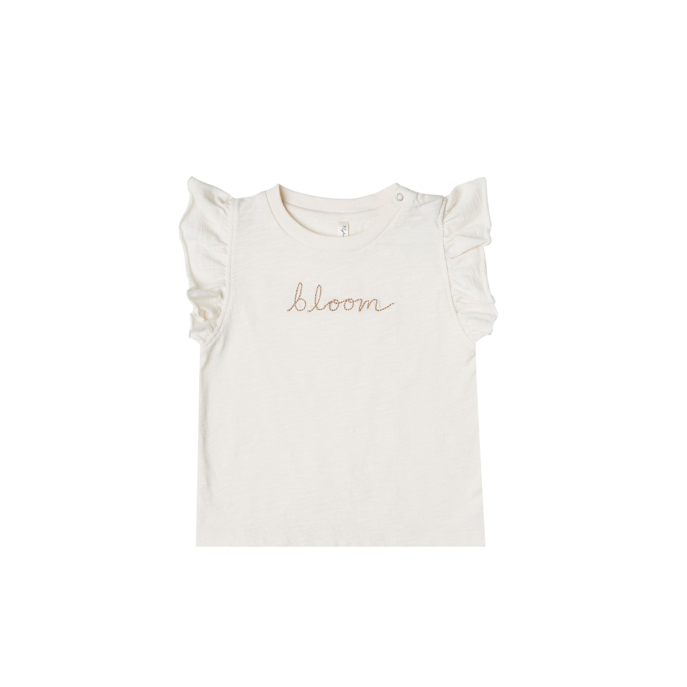 Wide strap ruffle tank with a boxy fit in a super soft fabric. Baby sizes 0-3m thru 18-24m have snaps at the shoulder for easy changing. Featuring our 'bloom' embroidery on ivory.