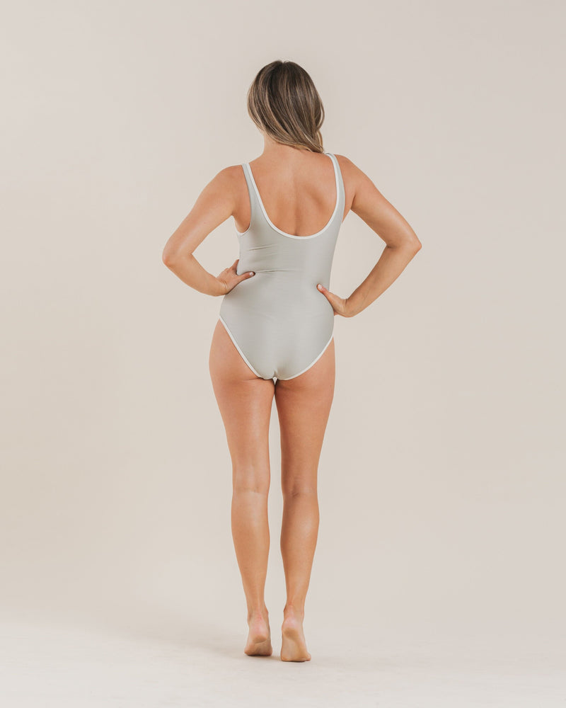 'This one-piece swimsuit has a lace-up front and lower scoop back in a fun ribbed fabric, with removable soft cups. Color: sage Care: Machine wash cold. Hang dry. We recommend washing your Rylee + Cru swimsuits on delicate to help them stay looking their best. Made of 83.5% polyaminde, 16.5% elastane'