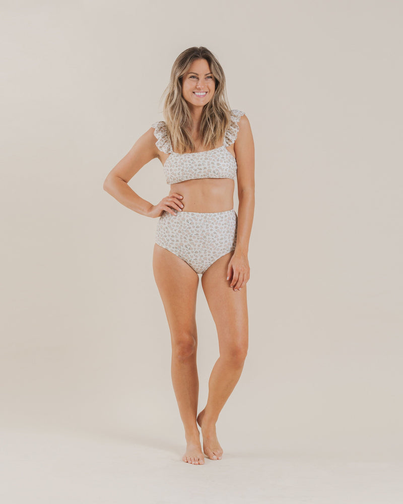 'Women's swim bikini top with ruffle straps that can be worn up or off the shoulder. Removable soft cups. Coordinates with our High Waisted Bikini Bottom. Featuring our 'superbloom' all-over print on natural. Care: Machine wash cold. Hang dry. We recommend washing your Rylee + Cru swimsuits on delicate to help them stay looking their best. Made of 80% nylon, 20% elastane. Lining made of 100% polyester.'