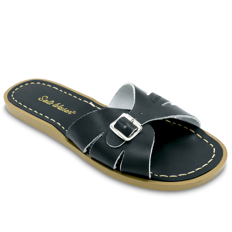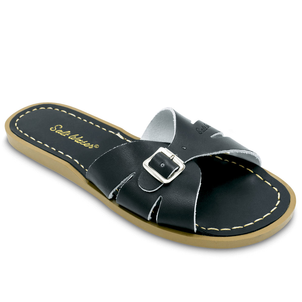 Salt Water® Classic Slides little kids, big kids and women. They boast an adjustable strap across the width of the foot for a secure yet open heal fit that allows you to slide them on and off. Rust-proof brass buckles and scuff-resistant, water friendly genuine leather make them ideal for in-and-out of water wear.