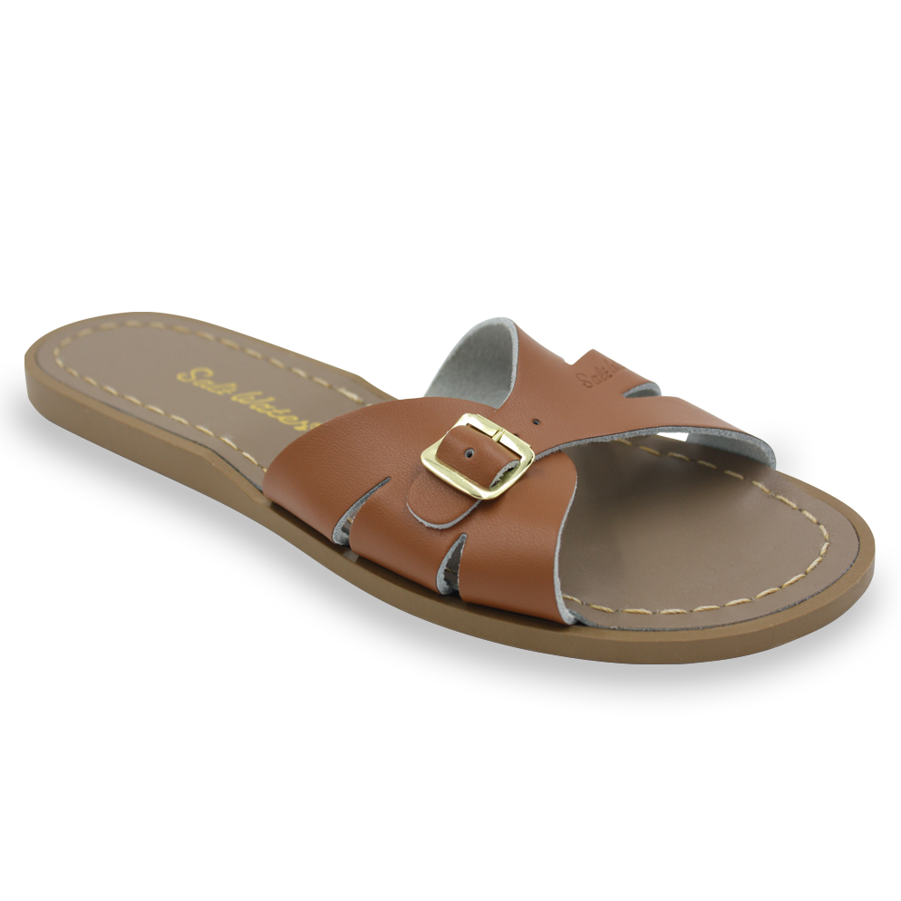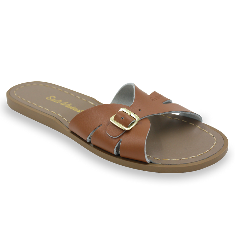 Salt Water® Classic Slides little kids, big kids and women. They boast an adjustable strap across the width of the foot for a secure yet open heal fit that allows you to slide them on and off. Rust-proof brass buckles and scuff-resistant, water friendly genuine leather make them ideal for in-and-out of water wear.