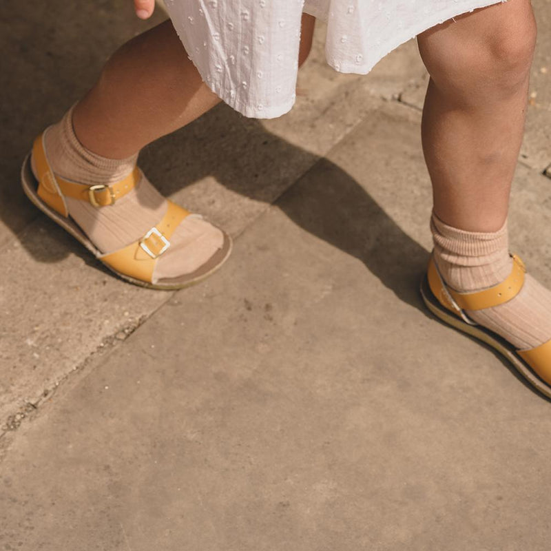 The Surfer is your classic two strap Jesus sandal. The adjustable toe buckle and ankle strap makes it the best all-rounder for both wide and narrow feet. The entire Sun-San range comes on a super comfortable spongy urethane sole with rust proof buckles. They can be worn in water and handwashed with a gentle detergent. The Surfer comes in several lovely colours, and a range of finishes including shiny patent and metallic. As seen on Romy Bauer, Salt-Water fan Sofia Coppola's little girl - the Surfer in white is a lovely fresh option and goes well with everything.