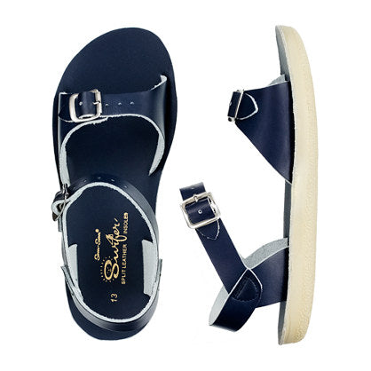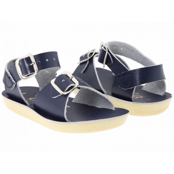 The Surfer is your classic two strap Jesus sandal. The adjustable toe buckle and ankle strap makes it the best all-rounder for both wide and narrow feet. The entire Sun-San range comes on a super comfortable spongy urethane sole with rust proof buckles. They can be worn in water and handwashed with a gentle detergent. The Surfer comes in several lovely colors, and a range of finishes including shiny patent and metallic. This is a lovely navy blue color.