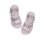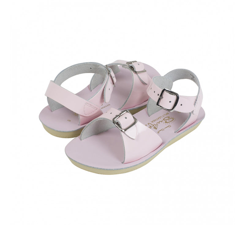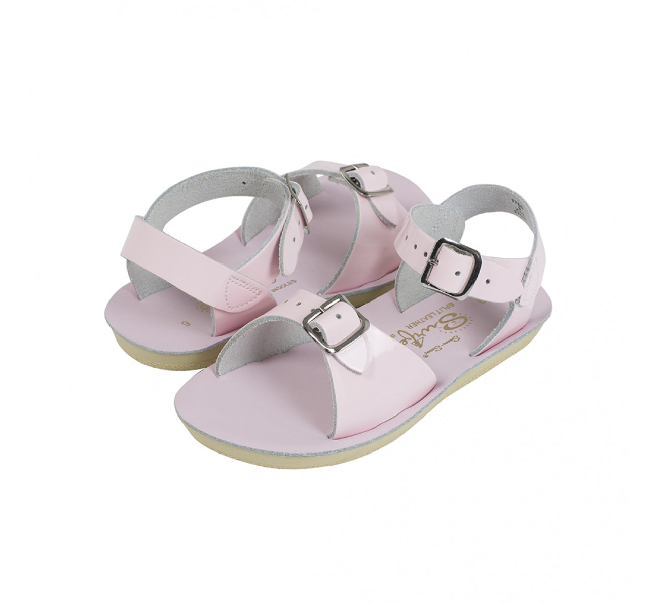 The Surfer is your classic two strap Jesus sandal. The adjustable toe buckle and ankle strap makes it the best all-rounder for both wide and narrow feet. The entire Sun-San range comes on a super comfortable spongy urethane sole with rust proof buckles. They can be worn in water and handwashed with a gentle detergent. The Surfer comes in several lovely colours, and a range of finishes including shiny patent and metallic. This is a lovely soft pink in a shiny finish.