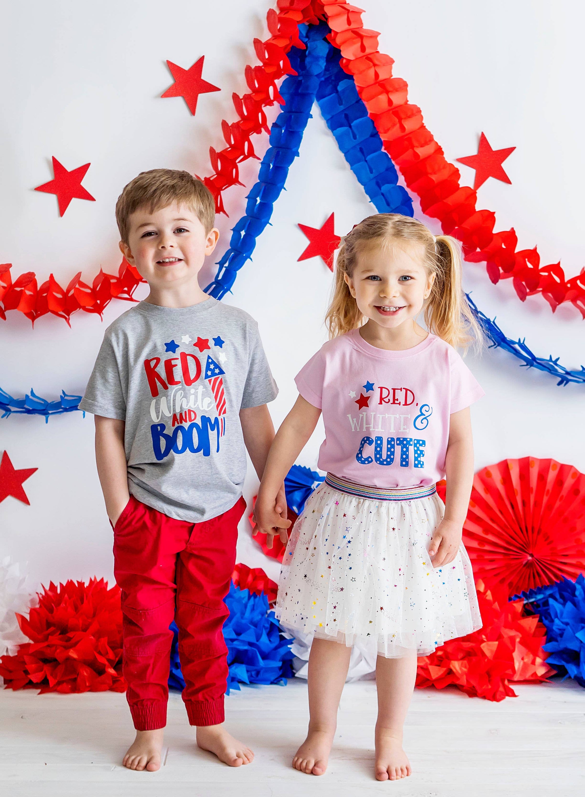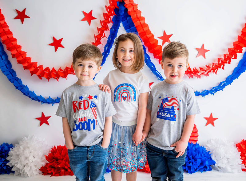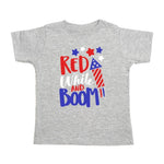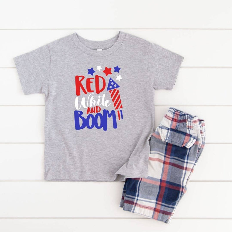 The Red, White & Boom short sleeve shirt is a handsome shirt for boys celebrating the 4th of July! The super soft fabric makes this shirt a comfortable option. Shirt Color: Gray Graphic Color: Red, White and Blue Material: 90/10 combed ringspun cotton/polyester Features: Topstitch ribbed collar, side seam construction, tagless Care: Machine washable, tumble dry low Each shirt is hand-pressed with love using child safe inks.